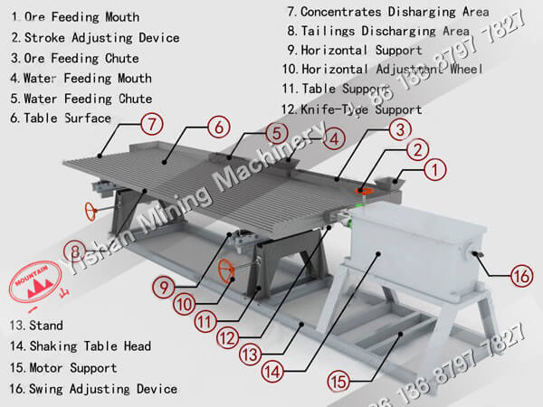 選礦搖床主要由床頭、電動機、調(diào)坡器、床面、礦槽、水槽、來復條以及潤滑系統(tǒng)等八個部分組成。