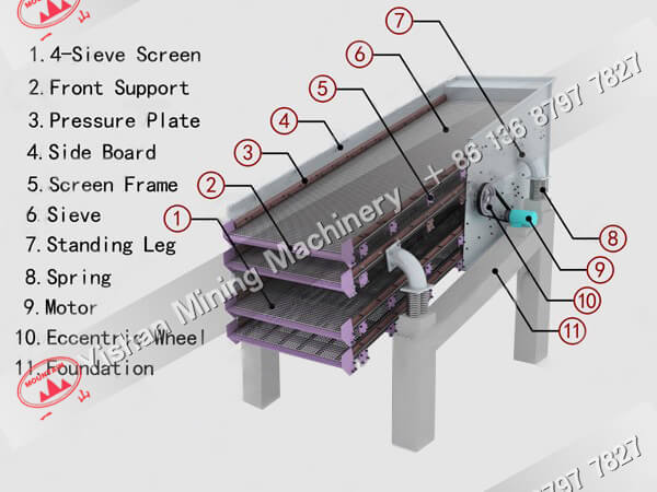 若有改變篩面傾角要求,對于座式振動篩可另行設計,對于吊式振動篩可由用戶通過調整吊掛裝置的鋼絲繩長度來實現;
